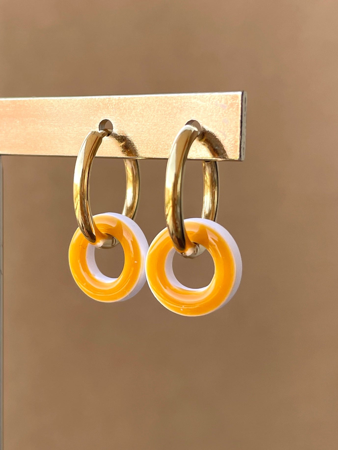 Pendientes de aro con personalidad. Diseño circular moderno en tonos vibrantes. Ligeros, cómodos y originales.