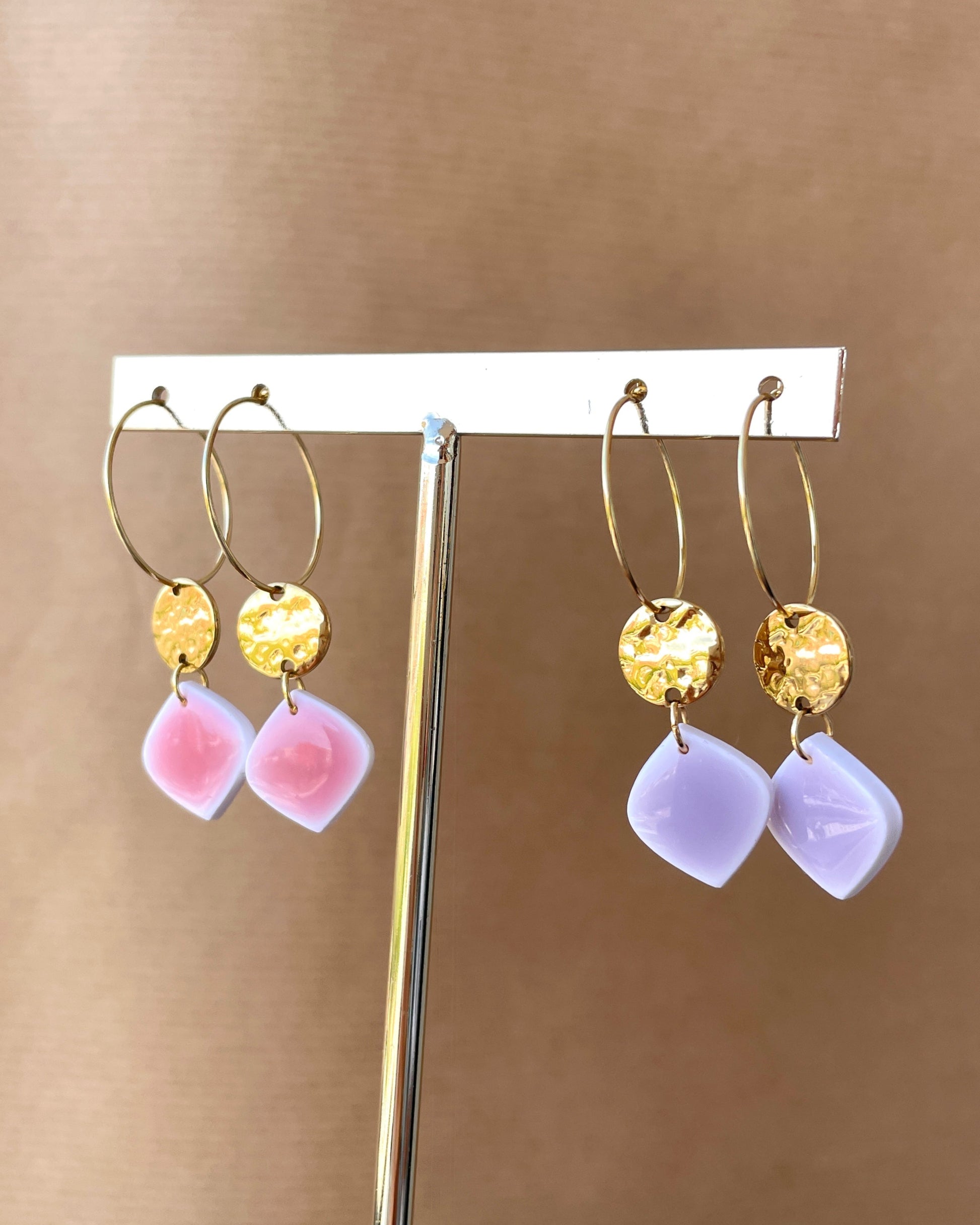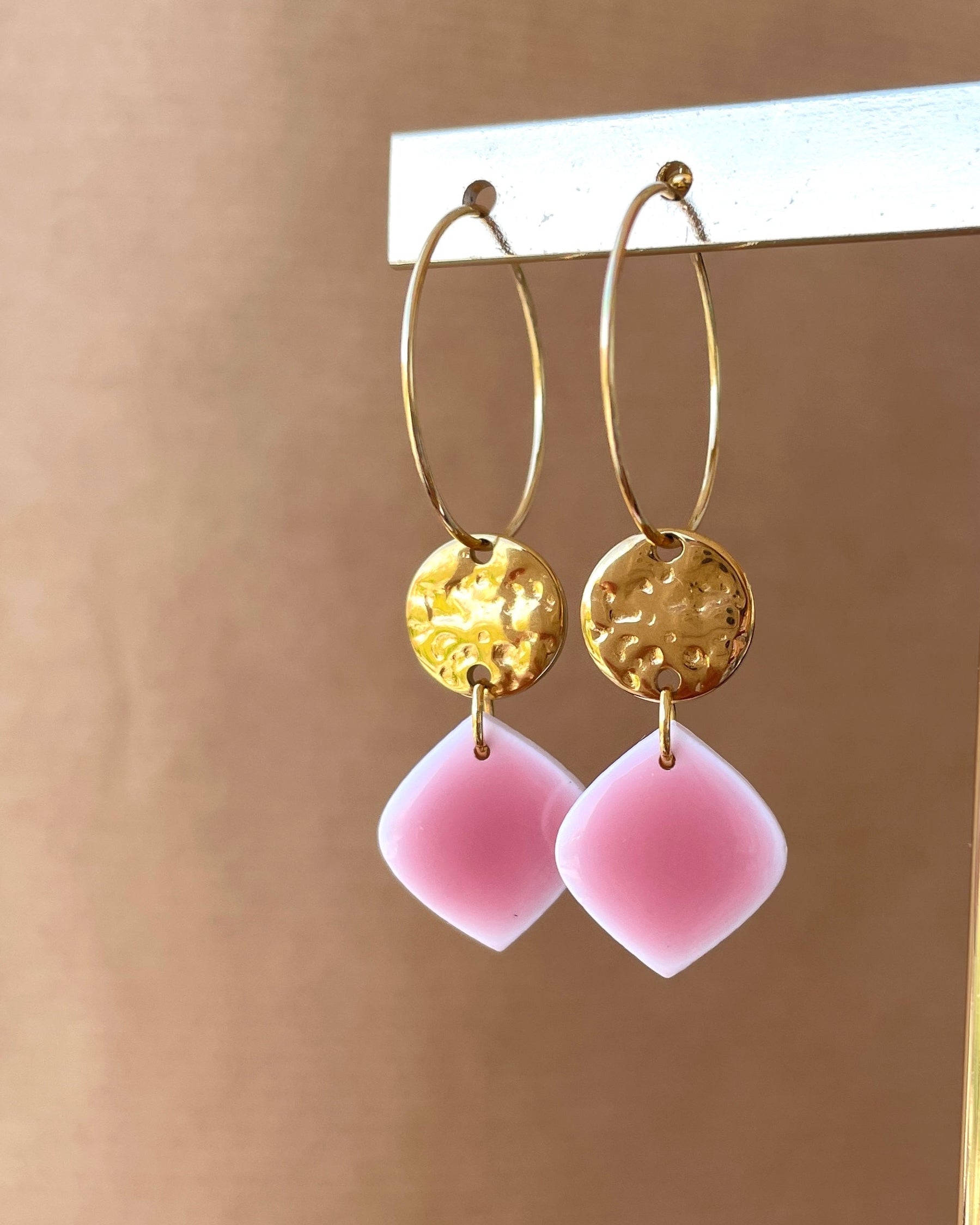 Los Pendientes Sira Rosa Luz son dulces, modernos y 100 % artesanales. Con un diseño suave en tonos rosa pastel, son perfectos para añadir un toque romántico a tu look diario.